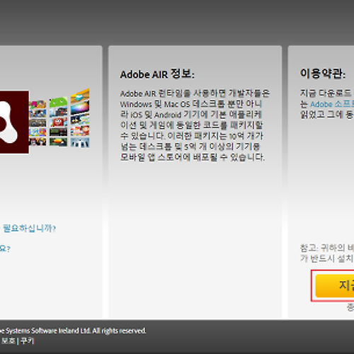 컴퓨터를 사용하다보면 어도비 플래시 플레이어나 Adobe air (어도비 에어) 프로그램이 필요할 때가 있는데요네이버에 어도비 에어를검색하면 소프트웨어 자료실에서 Adobe air를 다운로드할 수 있습니다Adobe air는브라우저의 제약 없이 독립형 클라이언트 응용프로그램으로실행되는 웹 응용 프로그램이구요어도비 에어 개발사 홈페이지로 안내하네요여기서 지금 다운로드를 누르면 Adobe air (어도비 에어)를 설치할 수 있습니다